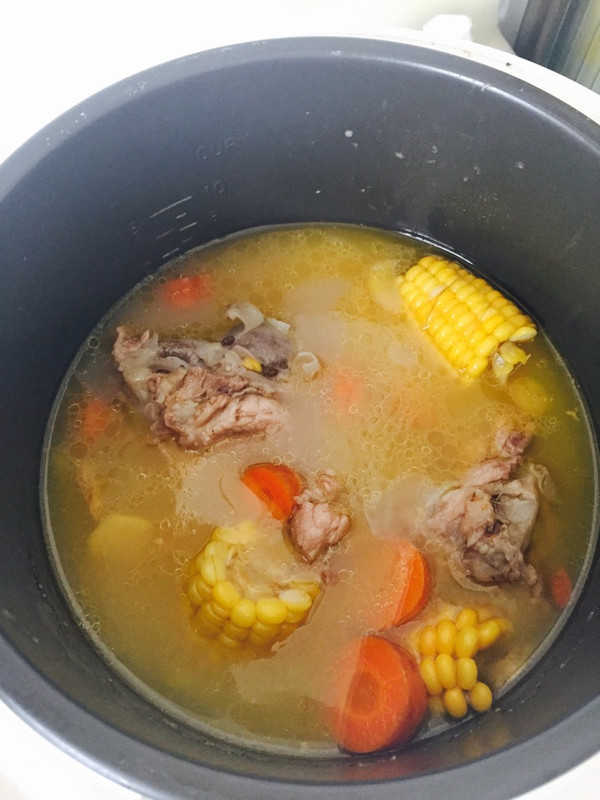 玉米胡萝卜洗净切段,等大骨棒煮两个小时后再放进去