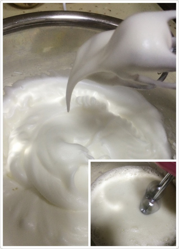 将蛋清滴入几滴白醋(最好用柠檬汁),将30g细砂糖分2次倒入蛋清中,然后打发至湿性发泡和硬性发泡之间,也就是提起打蛋器有一个弯勾样(如图所示)不要打太干,不然蛋糕卷会裂;