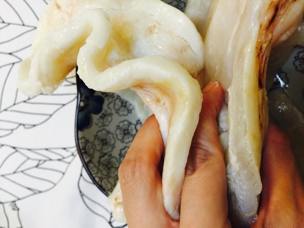 泡了12小时的花胶会有些软。把花胶拿出来后把水倒掉。