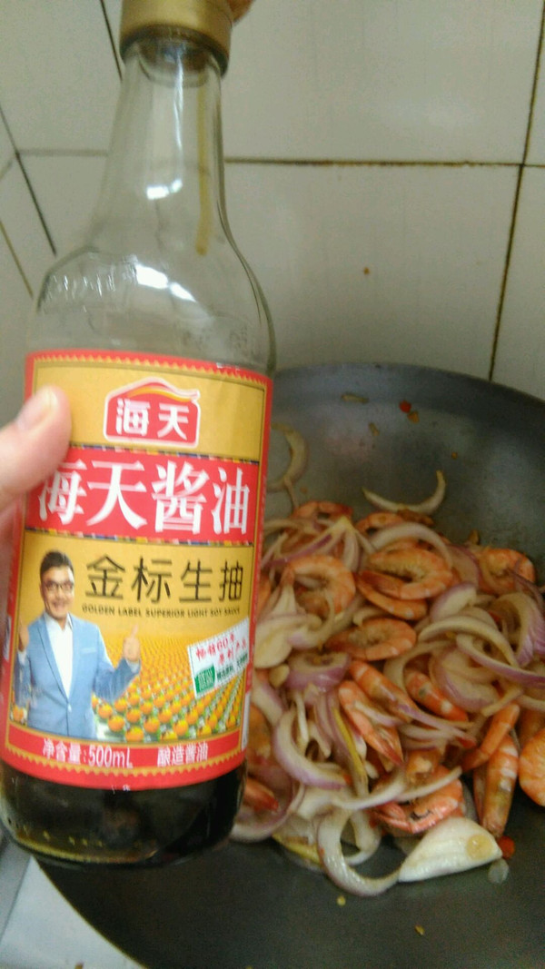 洋葱和虾子翻炒均匀后,即可放入生抽炒均匀