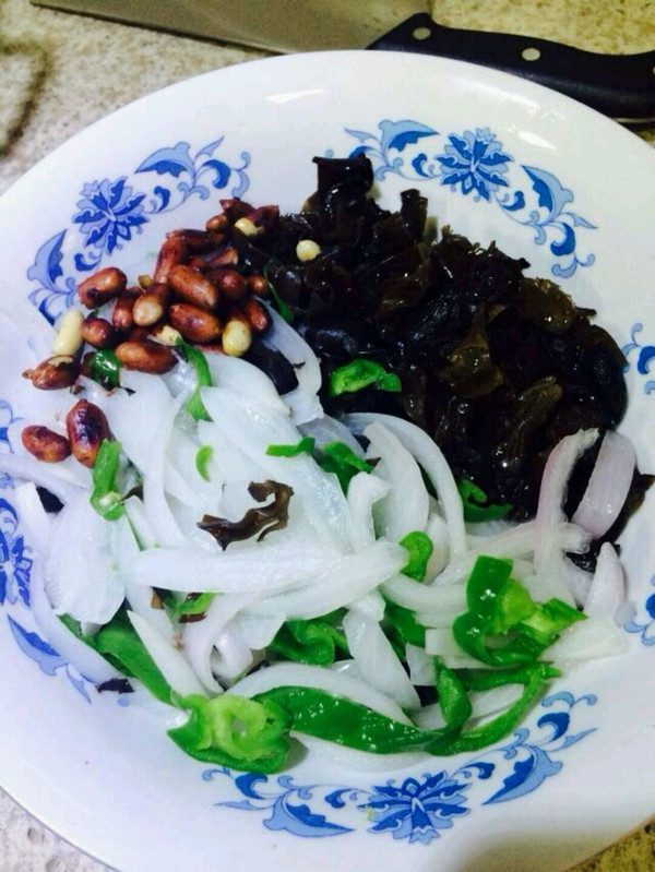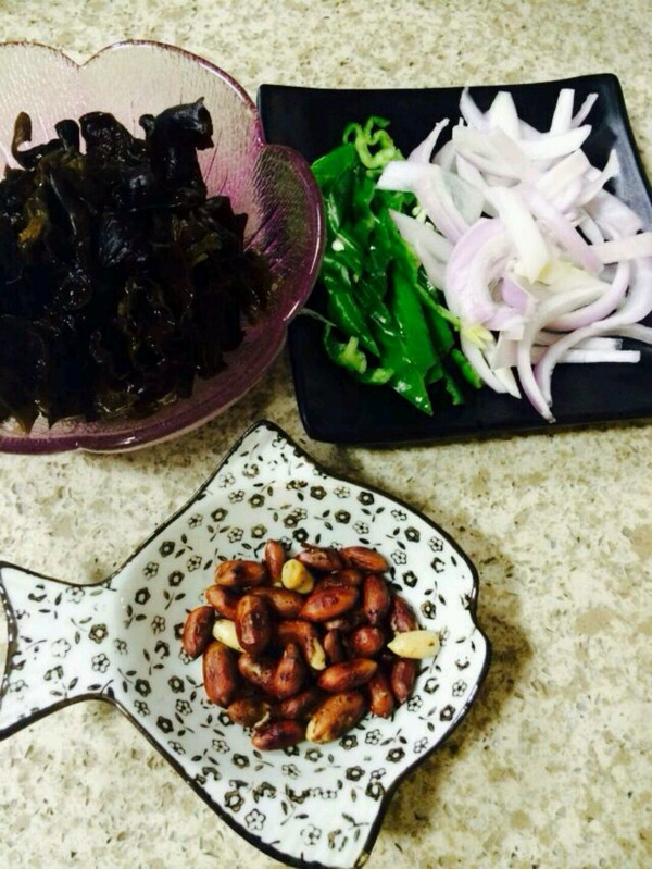 木耳提前泡发,花生米事先炒好了,三样菜洗干净,切成丝。