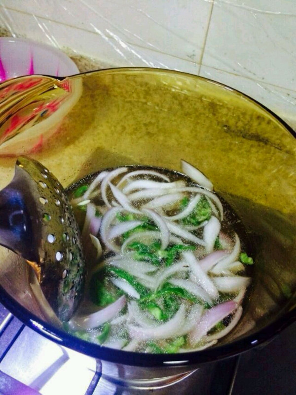 用煮木耳的水,煮洋葱和辣椒1分钟,捞出备用。