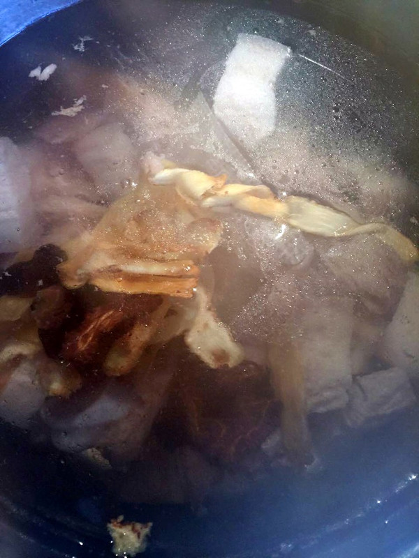 排骨和五花肉过水,锅里放一锅冷水,放入过好水的肉:加入肉骨茶包,大火煮开改小火焖煮3小时。