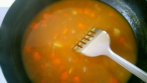 关火后,把咖喱放入锅里,用铲刀慢慢搅拌至咖喱融化