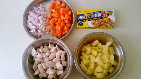 鸡脯肉洗净后切丁,用盐和料酒腌制20分钟入味,土豆,胡萝卜,洋葱都切丁备用
