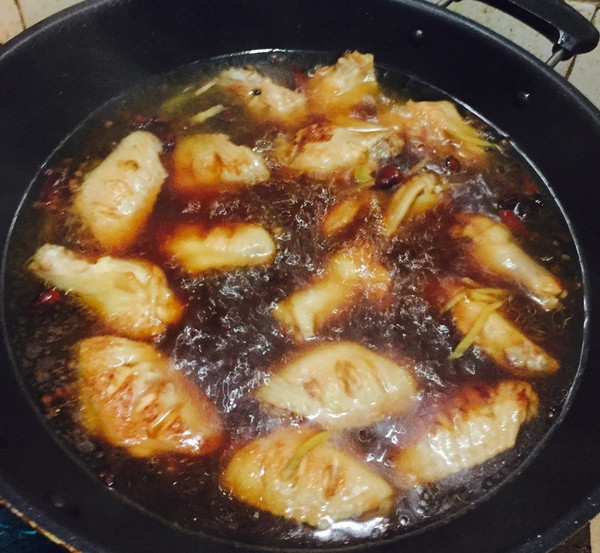 热锅凉油,油里加入适量白糖/冰糖,小火加热至糖融化起泡,加入腌好的鸡翅翻炒,用糖上色,鸡翅会呈现漂亮的金黄色,加入姜,花椒,干辣椒继续翻炒。