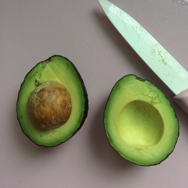 选一个六七分熟的牛油果,太熟就切不了薄片了。刀环绕果核切一圈。