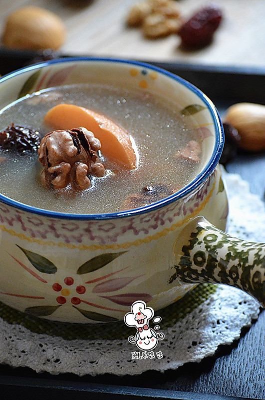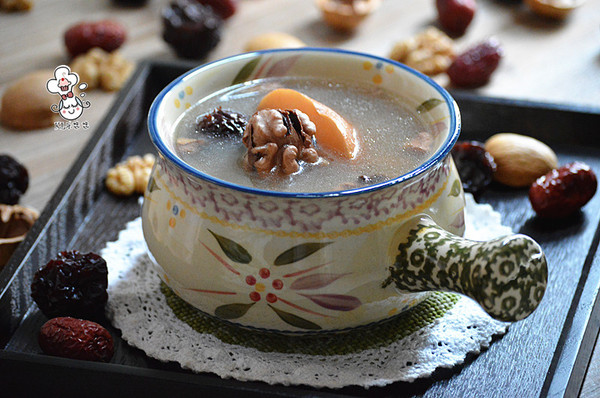 瘦肉焯水备用,红枣和黑枣去核;雪梨去心切成6瓣。