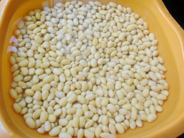 这是用清水浸泡了一晚的黄豆,浸泡后650克,要把泡不发的豆拣出来不要;