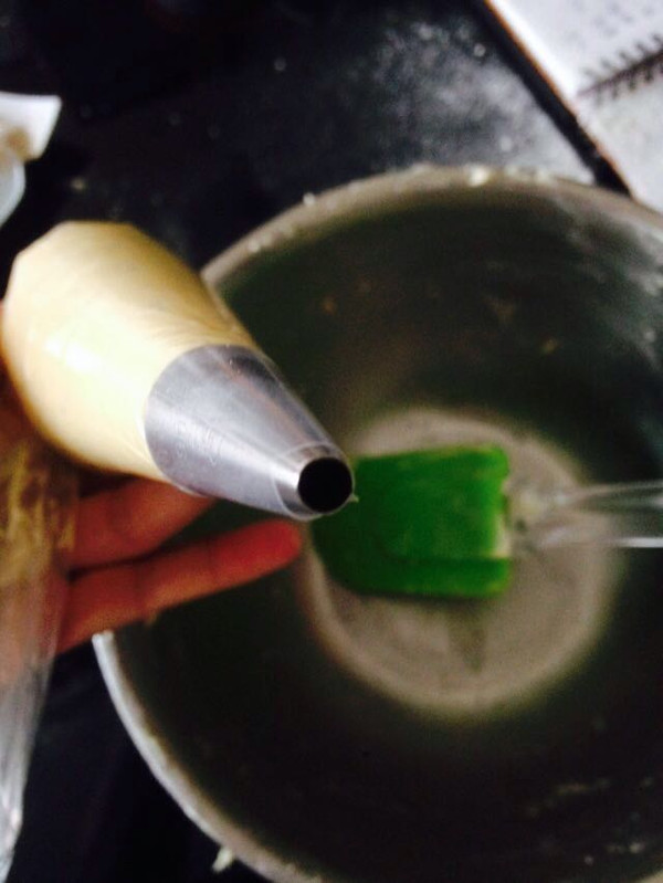 准备一个裱花袋,先把小的花嘴放进去,然后再放进去刚才做好的外圈团