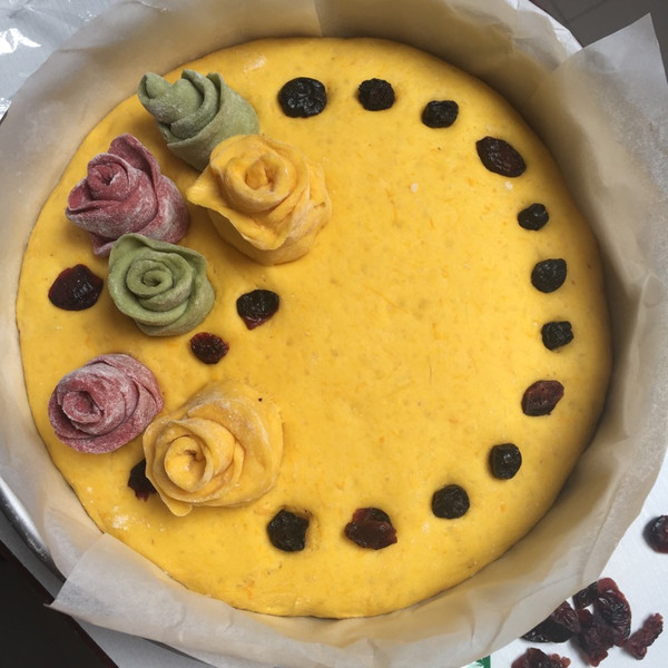 每个面团再分成两份,彩色面团分两份前各留出20克左右的面团做花朵用,分好的面团擀成圆饼,大小如八寸戚风模,小一些也可,还会发酵满的