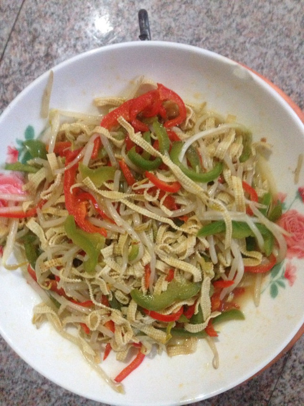 热锅倒油,放入红椒,青椒丝,炒一分钟左右放入豆皮,豆芽,翻炒片刻,放入盐,白糖,味精,胡椒粉,炒熟即可出锅。
