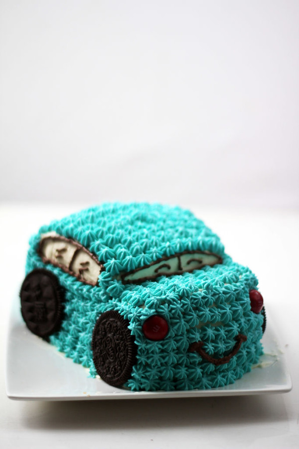 把剩下的淡奶油掺少许蓝色食用色素,用裱花袋在汽车表面挤上花,留出窗户;