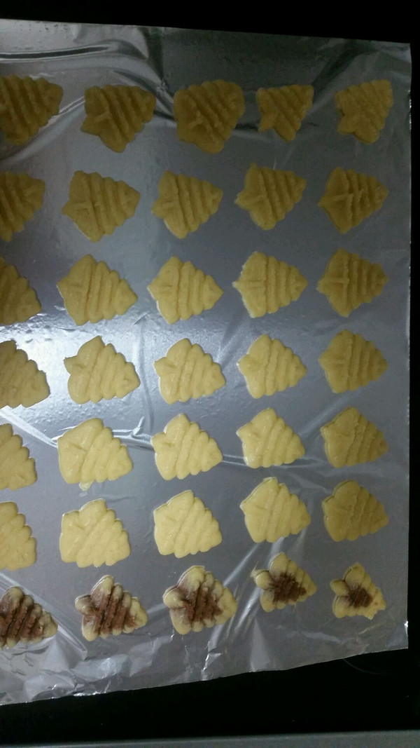 把面糊装进曲奇枪,分次在烤盘上打枪。不粘烤盘不需要放锡纸,我这次做的数量稍多,为快捷,有一部分直接用锡纸。