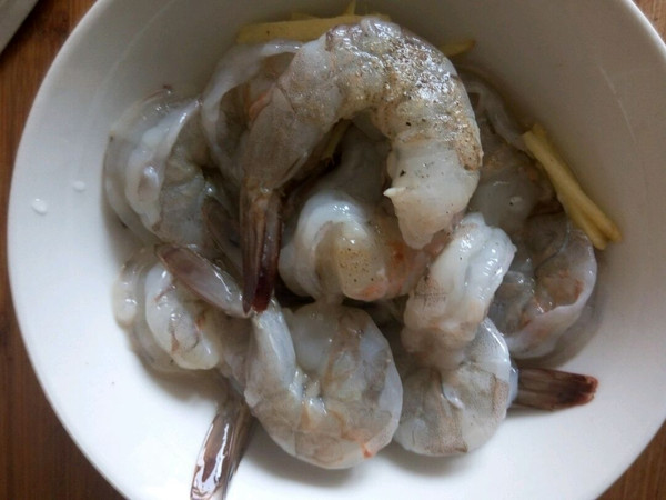 清洗干净的虾加料酒,胡椒粉,少量盐,姜片(姜片略大些,方便最后要挑出去)淹渍10--15分钟,挑除姜片。