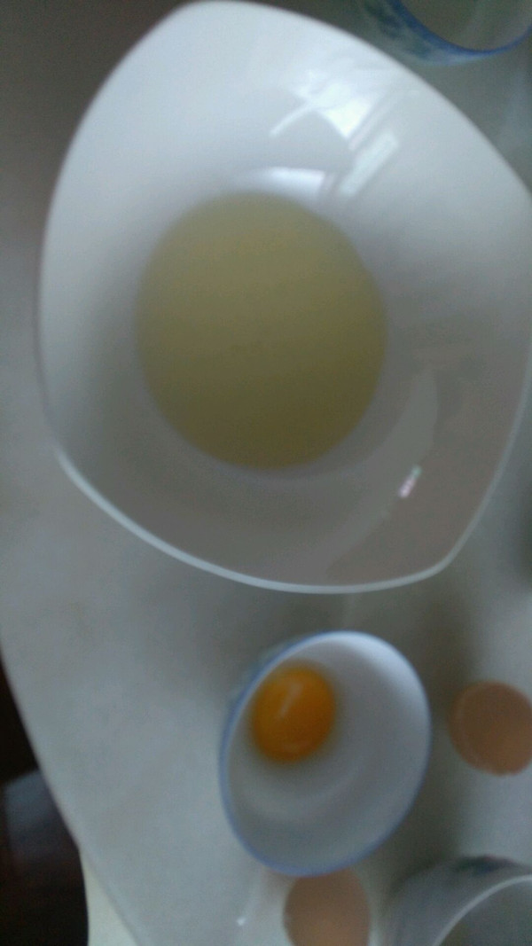 将蛋白分离,打发,打发蛋白和做蛋糕一样,将糖分三次加入,最后把蛋白打成带弯勾就好了。再滴2滴柠檬汁,并将玉米淀粉搅拌入内!