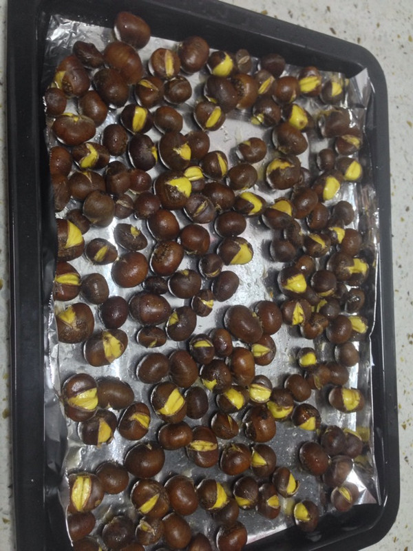 烤箱预热200度,烤盘铺锡纸,把板栗用玉米油翻拌后,平铺在上面,不要有重叠。上层烤15~20分钟。