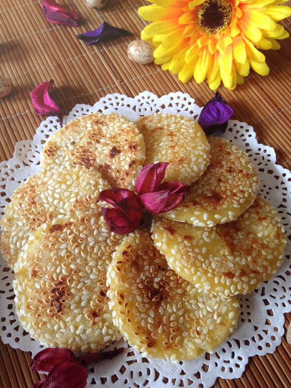 把滚好的小球放入芝麻中,滚几圈均匀粘上芝麻,再轻轻压扁成饼状。