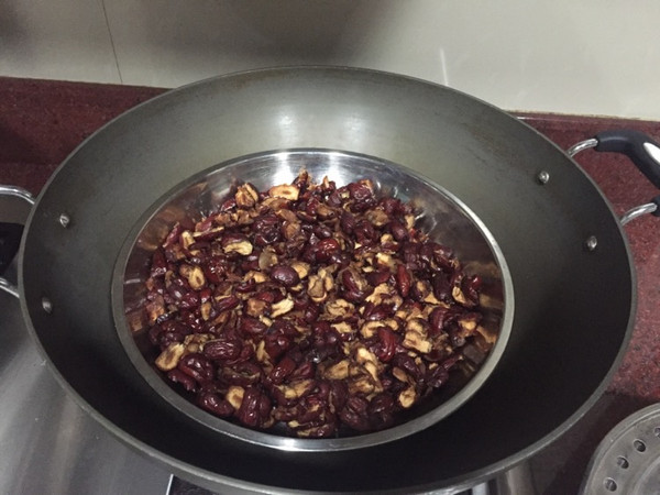 蒸熟后的红枣分几次加入料理机搅碎,加入适量的水,不要过多,水多了慢慢的炒干的时间就越长。