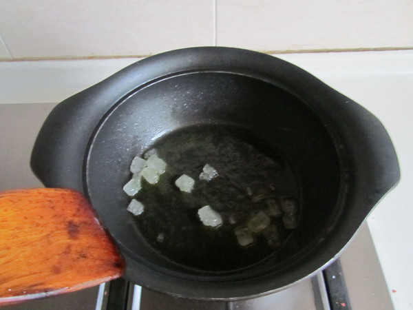 当冰糖完全融化,层棕色后下入排骨翻炒;