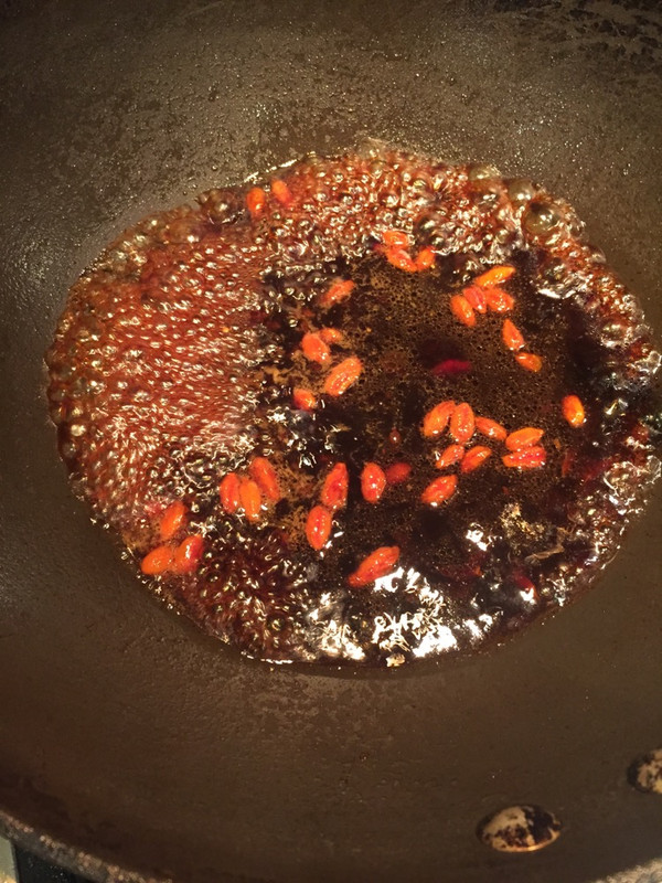 下枸杞,勾浓芡,淋在肘子上