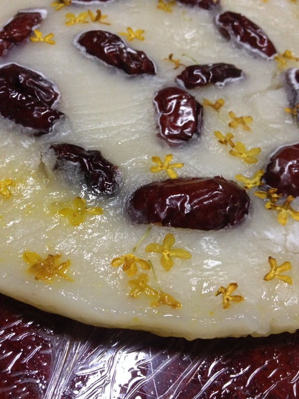 倒入模具中(需要在模具壁上涂一层食用油)在用红枣(可以用葡萄干)和桂花装饰一下。放入微波炉中,中高火叮5分钟。