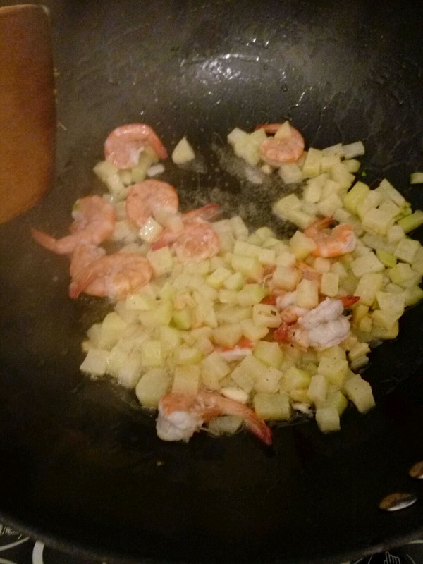 虾去头、去虾线洗净,用盐、胡椒粉、鸡精和生粉腌10分钟。土豆去皮切块丁, 其实可以加胡萝卜,因为我今天买菜的时候忘记拿胡萝卜了