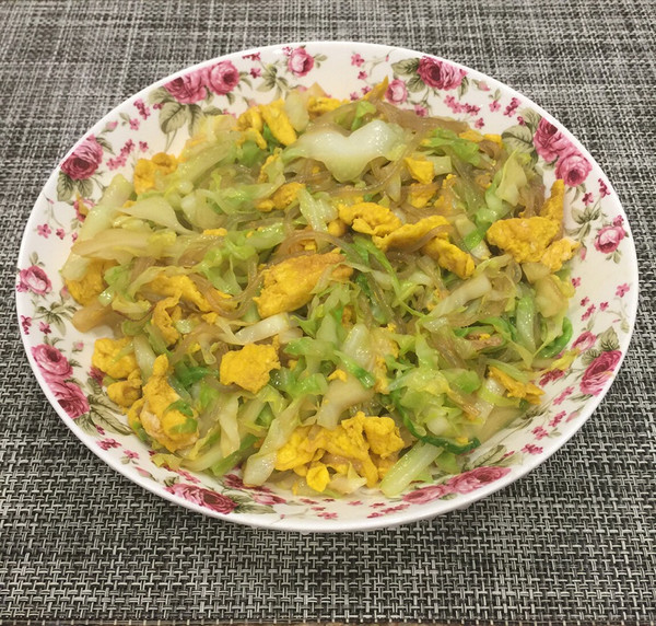 当包菜丝翻炒到软塌时入粉丝,将粉丝炒散开