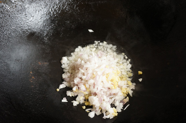 将洋葱、生姜片、大蒜切成末,锅中稍微多倒一点油,油热后将洋葱、蒜和生姜末倒入其中炒香