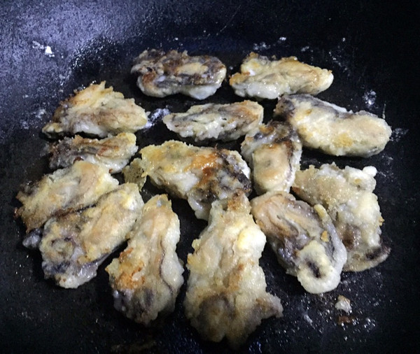 裹好干面粉的牡蛎摆入锅中,中小火开始煎制