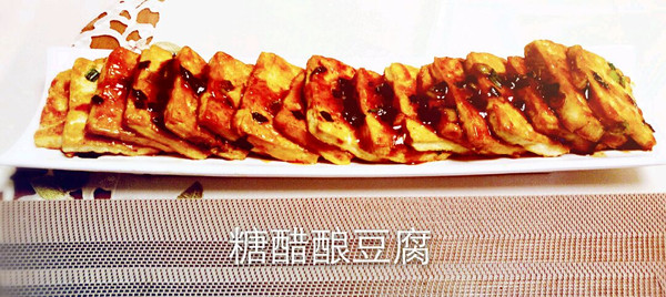 豆腐切片平底锅加植物油中小火烙成干,小碗加一匙白糖、两匙白醋、三匙白水、半匙淀粉、两匙生抽、虾皮粉(因为我不用味精)、葱花、蒜沫调汁,豆腐干烙至两面金黄倒入事先备好的调料汁翻炒两下。 调料汁也可以把白醋去掉,糖减剩一点点,加辣椒油就是韩式酿豆腐。[偷笑][调皮]
