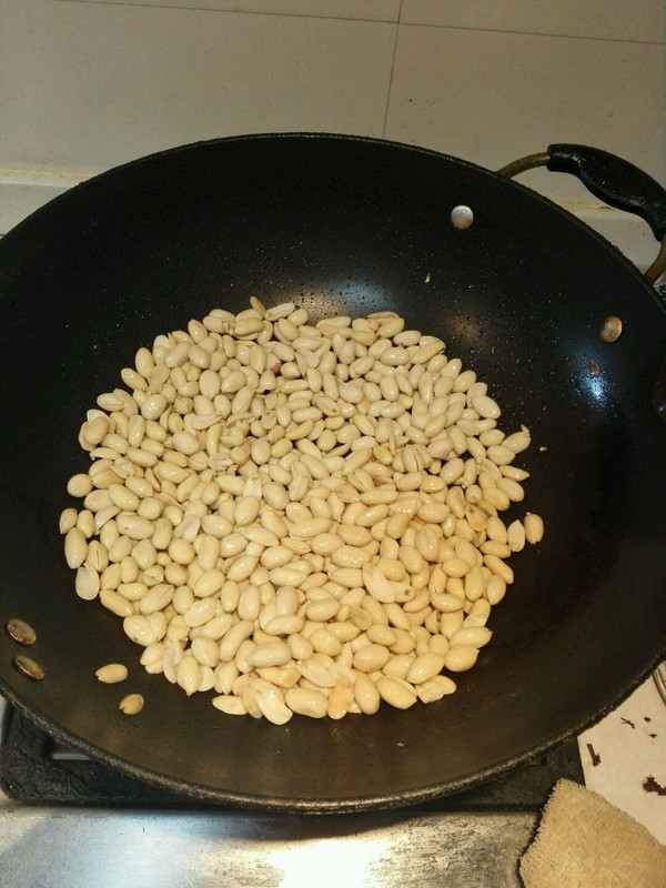 这里说说怎么把生的花生米炒熟。锅,开火,加一点花生油,不用等油热,直接倒入花生,小火炒20分钟左右,熟了即可。放凉。如果有烤箱,也可以150度烤15分钟,中途记得取出翻翻,不然就焦了
