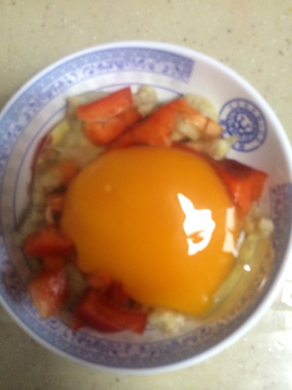 在把鸡蛋放上去。(鸡蛋最好放上面。不然不易熟)