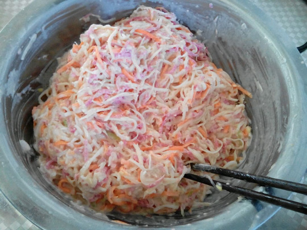 萝卜出水后打一个鸡蛋进去放入适量胡椒粉(我也放两小勺),虾皮一小把喜欢可以多放一些盐就少放点,在放半碗面粉搅拌,拌啊拌(用手抓也可以)