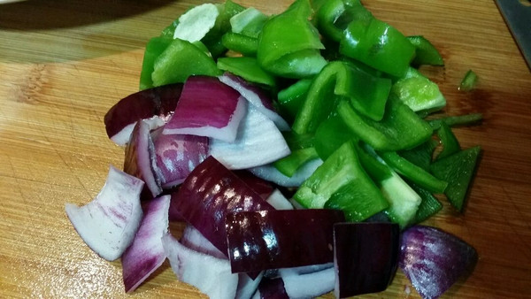 锅中放少许油,放入柿子椒,洋葱煸炒,放少许盐,炒熟盛出备用。