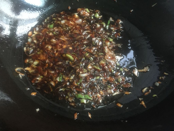 炒锅烧油,油温热,将大葱放入炒香,然后调入生抽和老抽。