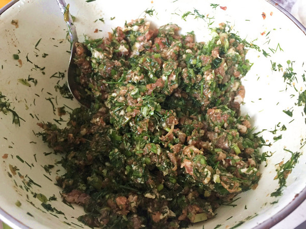 将葱油倒入绞碎的肉中,朝一个方向搅拌。搅拌好后再将茴香放入一起拌匀,最后包的时候调入适量盐。
