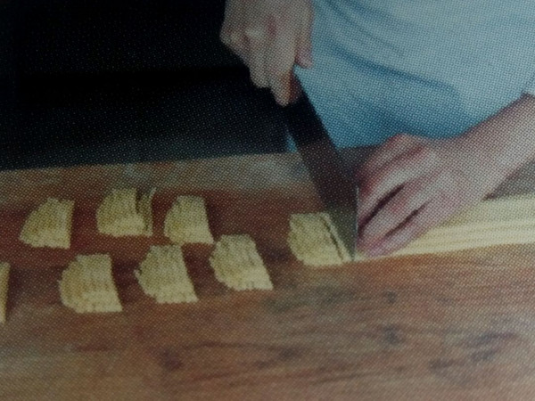 将面擀成长方薄片,依次叠成梯形,在用刀切成细丝,七刀一组。