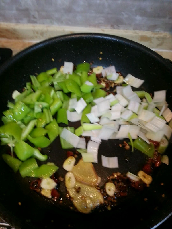 锅烧热倒油放入干辣椒,花椒,姜片,蒜片炒香