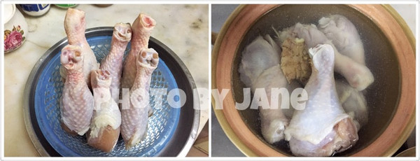 鸡腿用盐腌至少6小时或过夜,洗净沥水,放入开水中,放入姜片。再次煮沸后煮3-5分钟,视鸡腿大小,盖盖闷半小时