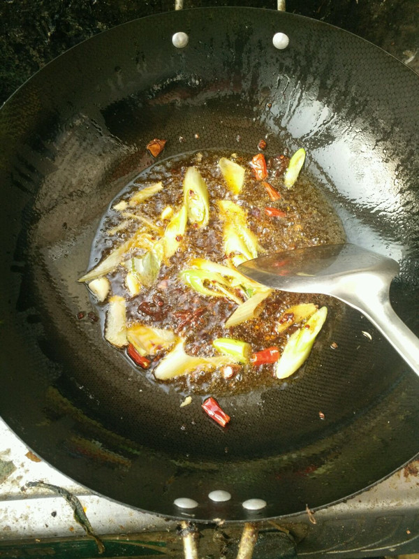 炒锅加热、倒入食用油、放葱段 、姜片、蒜瓣、八角、干辣椒炒香】 加入适量麻辣酱、 炒香