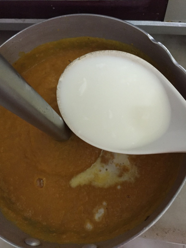 料理机将南瓜火腿打烂,加入两汤勺牛奶打顺滑