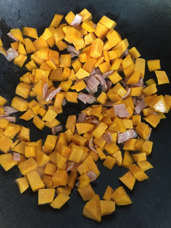 南瓜切小颗粒,火腿切小,下油锅炒香,加1/4小勺盐