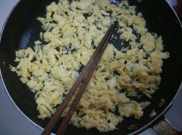 用筷子不停的搅动,这个方法很简单,多放油防止鸡蛋粘在一起,和馅的时候就不需要在放油了,鸡蛋这样不停的搅动鸡蛋也不用在剁碎了哦!跟妈妈学的很实用的办法。