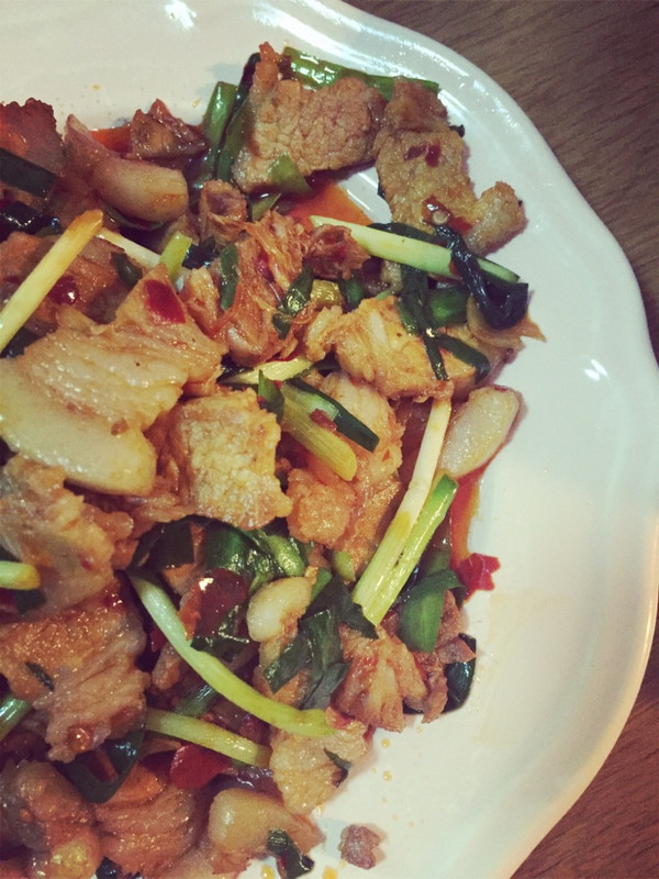 油倒锅里后,下葱姜蒜爆香,把切好的五花肉倒里别怕像个爷们一样炒,基本不会蹦油到胳膊上,炒到肉质变硬,油出去差不多了加入一大勺子的豆瓣酱,进去翻炒,炒啊炒,炒啊炒!