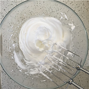 先用打蛋器把蛋清搅打成鱼眼泡状态,然后细砂糖分三次加入到蛋清中,打发成成干性发泡状态;