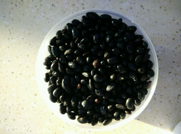 将泡好的黑豆放入锅中,在黑豆上放入冰糖,倒入水,盖盖中火煮至糖化透。