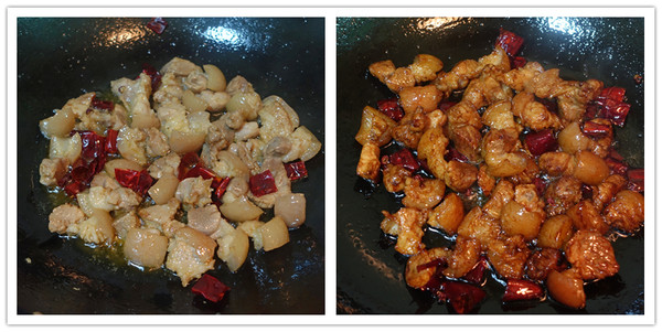 下姜片、盐、辣椒段、花椒煸炒;分三次烹入高汤,让猪肘肉吸水回软,不会表面发硬。加老抽、白糖翻炒上色调味