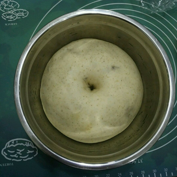 面团发酵至两倍大,用手指蘸上面粉插入面团,抽出后面团凹洞不回弹或回弹缓慢,即基础发酵完毕(如果凹洞很快回弹是发酵不足,如果面团塌陷则说明发酵过头了);