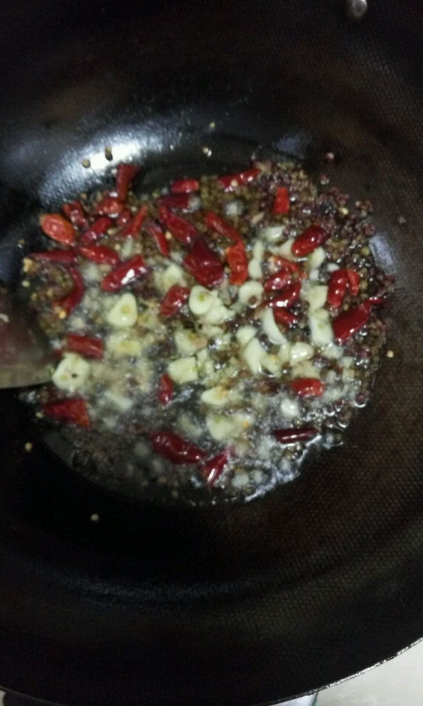 准备好所有材料后…油倒入锅内烧热…放花椒和干辣椒…炒香